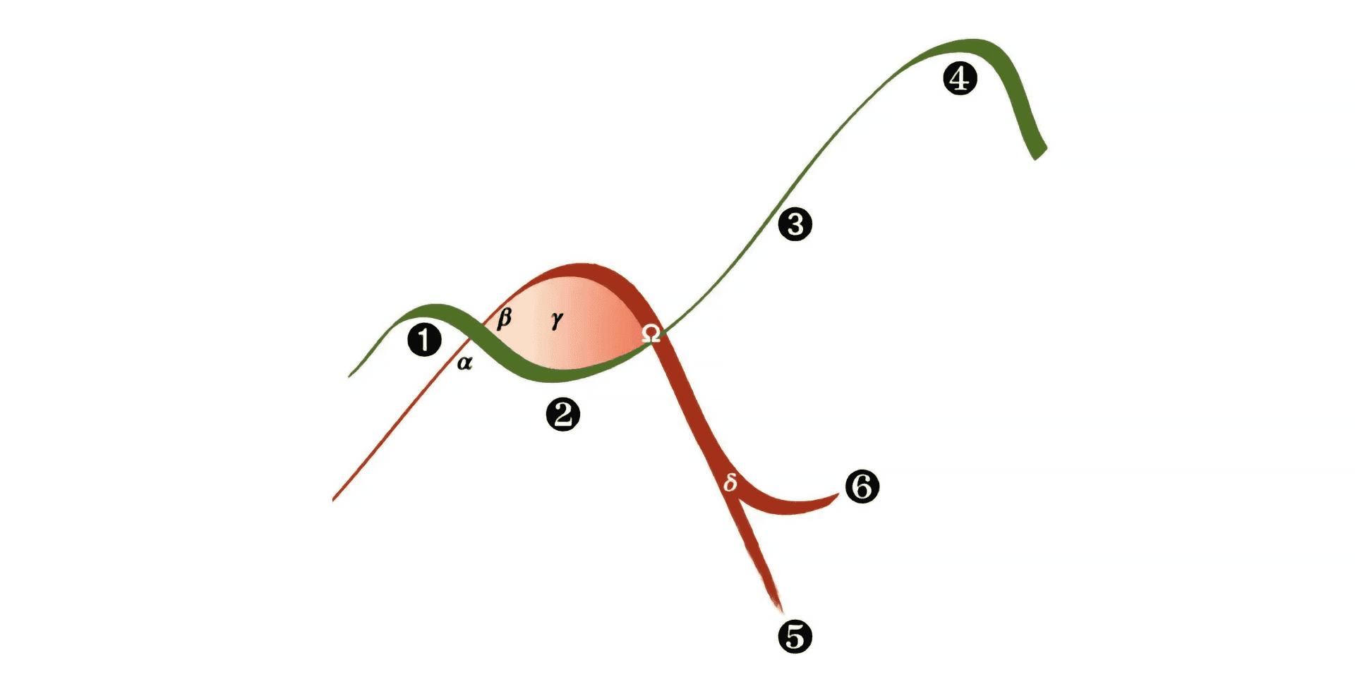 No Flexuous Curves (FC), uma ideia representada pela curva verde nasce como uma inovação (1), atravessa uma fase de transição (2) e ganha tração (3) até atingir seu ápice (4). Já a ideia atual representada pela curva vermelha atinge seu ápice e entra em declínio (5) ou em uma possível recuperação (6). Os cruzamentos entre as curvas geram pontos de inflexão que representam a intersecção entre as ideias (alfa α), a percepção de disrupção (beta β), o espaço entre o ápice da ideia atual e o abismo da inovação (gama γ), a transição final entre as duas curvas (omega Ω) e o declínio da ideia atual (delta δ). Como tudo o que envolve o ecossistema Cynefin, essas lentes ajudam a compreender a realidade e a iluminar a tomada de decisão.